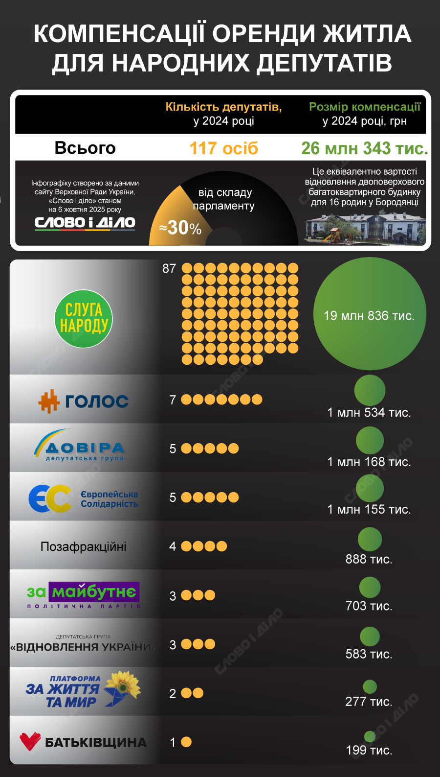 Так, станом на початок 2025 року компенсацію виплатили 117 нардепам. У “Слузі народу” компенсацію отримали 87 осіб (19,8 млн грн за 2024 рік). У фракції “Голос” орендували житло 7 народних обранців (1,5, млн грн), у Європейській солідарності та депутатській групі “Довіра” — по 5 парламентарів-орендарів (по 1,2 млн грн). Серед позафракційних нардепів компенсацію отримали 4 депутати (0,9 млн грн).